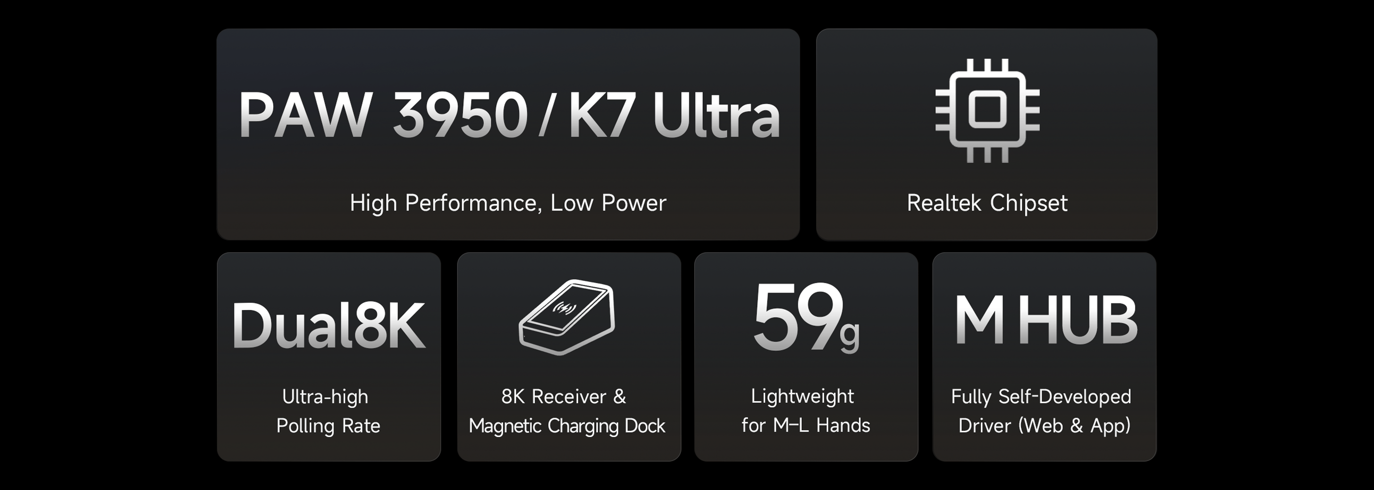 Our first magnetic charging dock delivers contact-free, wear-resistant charging while doubling as a high-speed 8K receiver. It features a full 360° atmospheric RGB light ring that adds a stylish glow to your setup, with customizable lighting effects controlled via the M HUB driver.