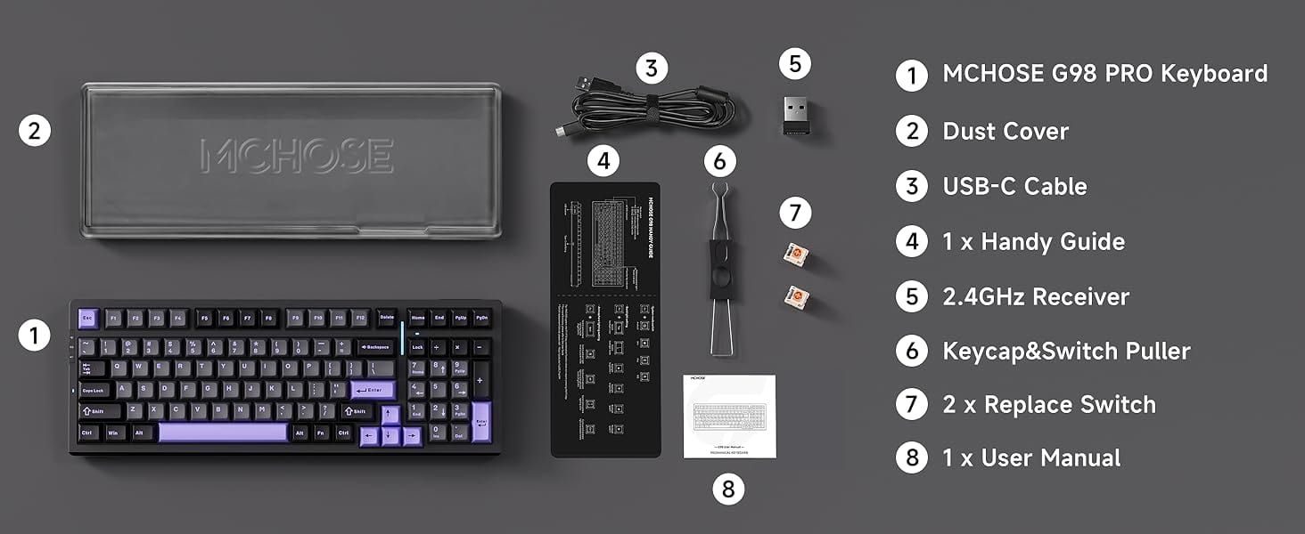 The MCHOSE G98 Pro is a versatile tri-mode mechanical keyboard featuring a compact 98% layout, TOPSPEED low-latency wireless connectivity, and an ultra-high-capacity 8000mAh battery. With its advanced gasket structure and five layers of sound-dampening padding, it offers a quieter and enhanced typing experience. Perfect for gamers, the G98 Pro is designed to elevate your gaming setup with exceptional performance and style.
